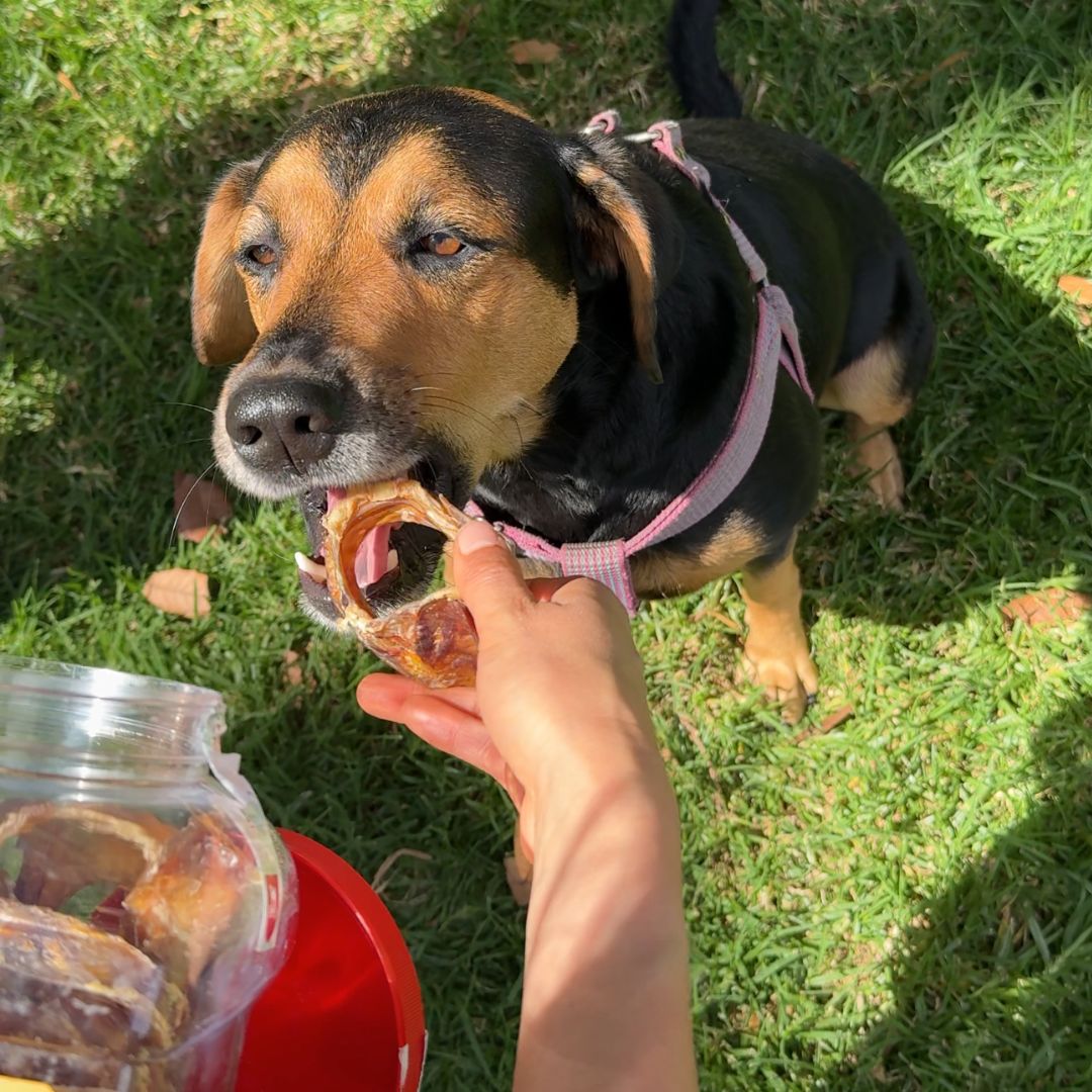 - Salud Dental Mejorada: Al masticar, los aritos ayudan a limpiar los dientes de tu perro, eliminando el sarro y ayudando a combatir el mal aliento.