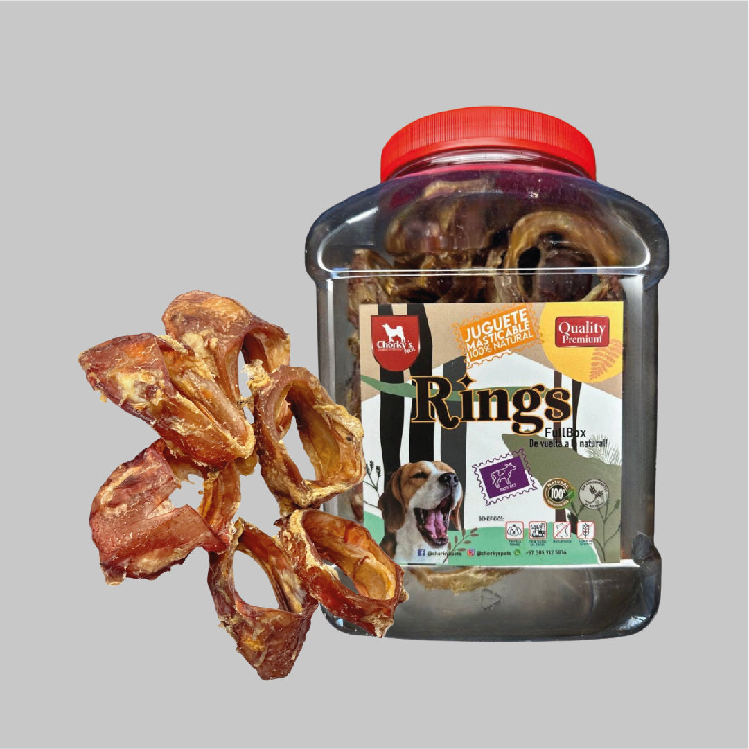 - Entretenimiento Prolongado: Su forma en aritos favorece una masticación prolongada, lo que mantiene a tu perro ocupado mientras disfruta de un snack saludable.